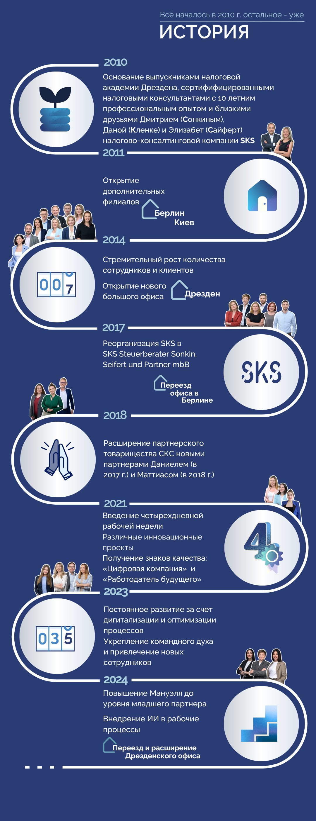 Ценностями нашей компании являются хорошо организованная структура, эффективное взаимодействие между сотрудниками и с клиентами, дигитализация документооборота, интернациональная и многоязычная команда, а также высокое качество оказываемых услуг. Наша кадровая политика ориентирована на самореализацию наших сотрудников, мы предоставляем им, помимо конкурентноспособной заработной платы, бонусы и повышение квалификации, что привлекает наиболее квалифицированных специалистов в нашей сфере. Таким образом, в долгосрочной перспективе мы стремимся стать ведущей компанией в сегменте налогового консалтинга.
